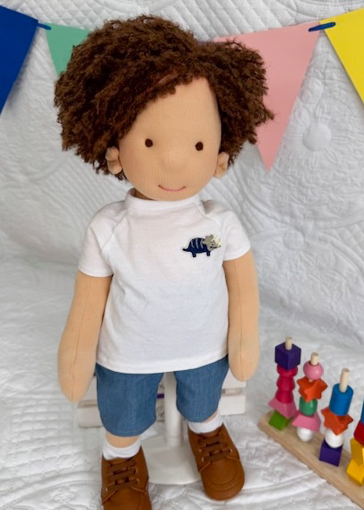 His skin is made from DeWitte Engel Sunkissed Jersey. His hair is looped mohair. He is wearing a white cotton T-Shirt with a dinosaur motif, denim shorts, white socks and soft brown shoes. He is 19.5 inches in height and has movable arms and legs. He is ready to find a forever home with lots of cuddles.