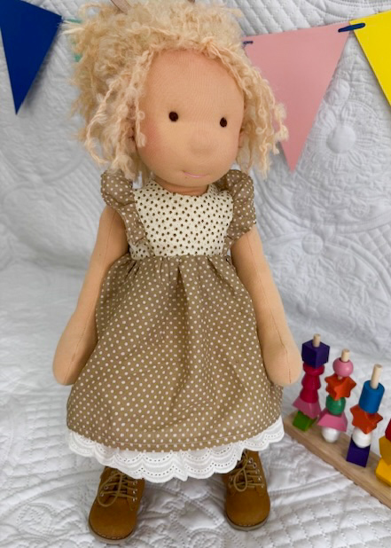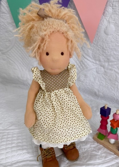 Her skin is made from DeWitte Engel Sunkissed Jersey. Her hair is made from a honey coloured mohair wool. She is wearing She is wearing pointelle knickers, a cotton frilled slip, a cream and light brown flutter frill dress, white ankle socks and lace up boots. She is 20 inches in height and has movable arms and legs. She is ready to find a forever home with lots of cuddles.