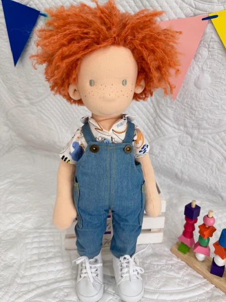 His skin is made from DeWitte Engel fair Jersey. His hair is tangerine looped mohair and he has beautiful green eyes and cute freckles over his nose. He is wearing white boxer shorts, dinosaur print shirt, denim dungarees, white socks with white baseball boots. He is 20 inches in height and has movable arms and legs. He is ready to find a forever home with lots of cuddles.